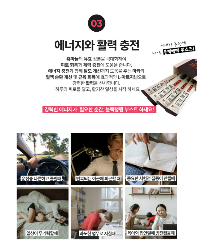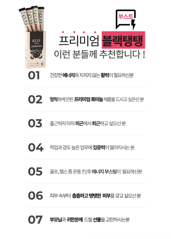 고흥 흑마늘 제품 효과 짱짱!!!!!!! 평소 건강식품을 챙겨줘도 크게 반응 없던 신랑이 흑마늘엑기스를 꾸준히 먹더니 “감기도 덜 걸리고, 요즘은 피곤한 것도 훨씬 덜하다”고 스스로 말하더라고요. 저는 블랙탱탱을 먹고 있었는데 블랙탱탱은 불면증에 좋다고 하더라구요. 실제로 엄마와 언니가 불면증으로 고생하다가 블랙탱탱 먹고 효과 봤다고 해서 처음 접하게 되었는데 저는 잠은 잘 자는데 피로감이 심해서 피로회복에 더 효과가 좋다는 블랙탱탱 부스터까지 추가 구매하게 되었습니다. 가족들도 효과를 보고 신랑도 자발적으로 챙겨 먹는 걸 보면 만족감 200%입니다. 구입하고 일주일 정도 아침에 부스터, 저녁엔 그냥 블랙탱탱 먹는데 확실히 피곤이 덜합니다. ✅ 섭취 후 변화는 이렇게 달라졌어요: - 면역력 상승: 예전 같으면 환절기마다 감기에 시달렸는데, 이번에는 무탈하게 지나갔어요. - 피로 회복: 퇴근 후에도 예전보다 한결 덜 지친 모습이라 가족 모두가 느낍니다. 특히 저는 아침에 일어나서 많이 피로한데 그게 덜해졌어요. - 몸에 맞는 느낌: 속이 편하고, 먹고 나서 소화나 컨디션 면에서도 부대낌이 없어요. - 부담없는 맛: 흑마늘이지만 많이 달거나 마늘향이 진하지 않아서 중학생 아이들까지 잘 먹어요. |