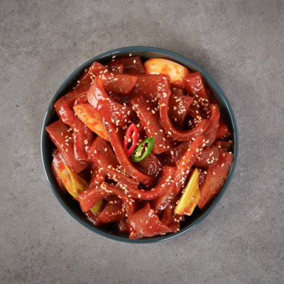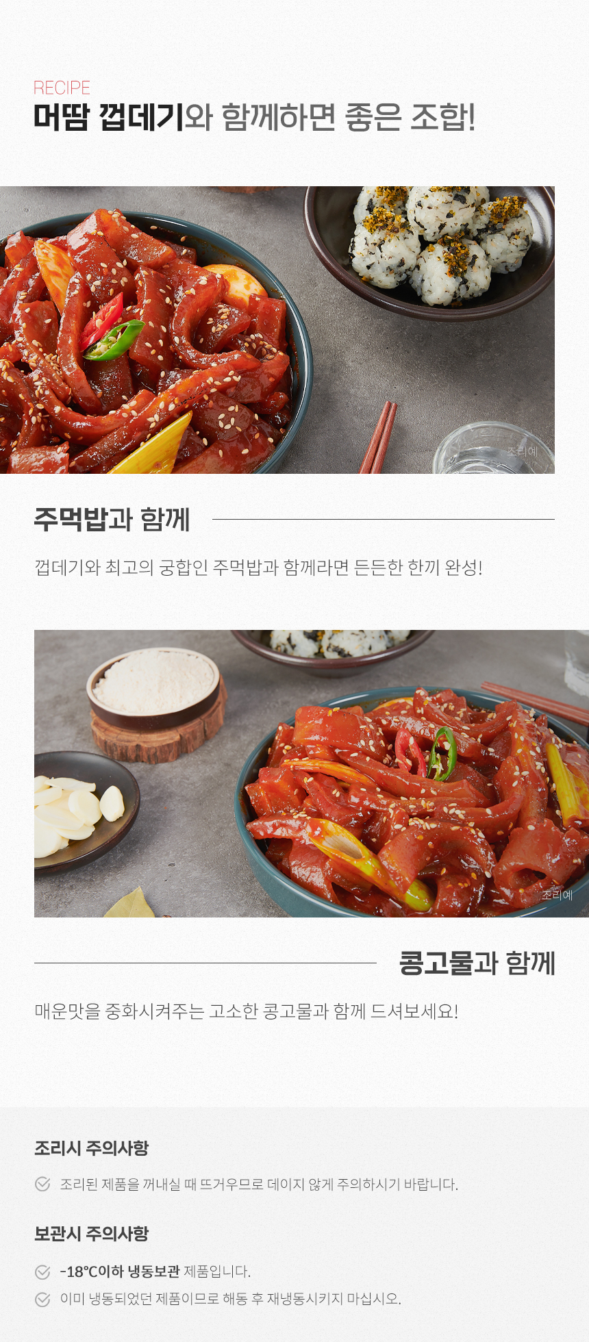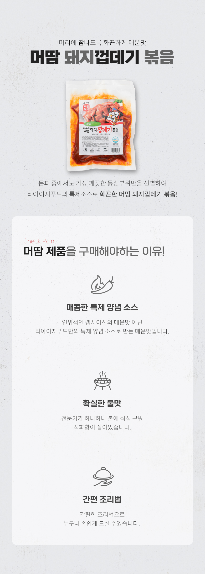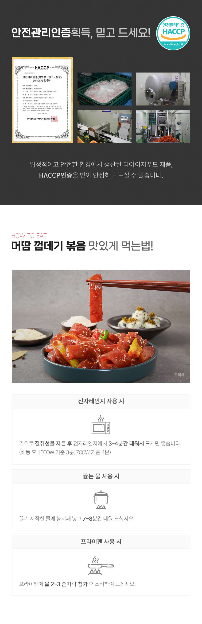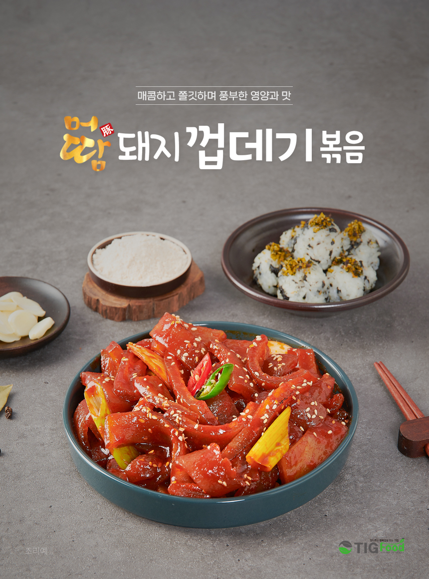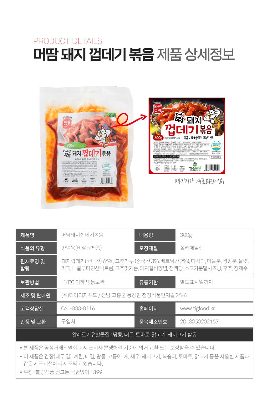 | 원재료명 및 함량 | 돼지껍데기(국내산65%), 고춧가루(중국산3%,베트남산2%), 건마늘분말, 건생강분말, 기타 |