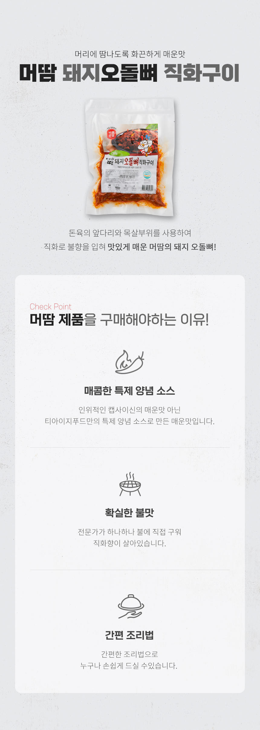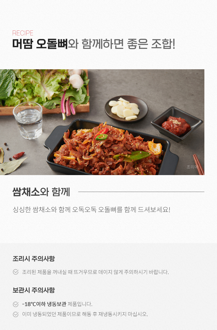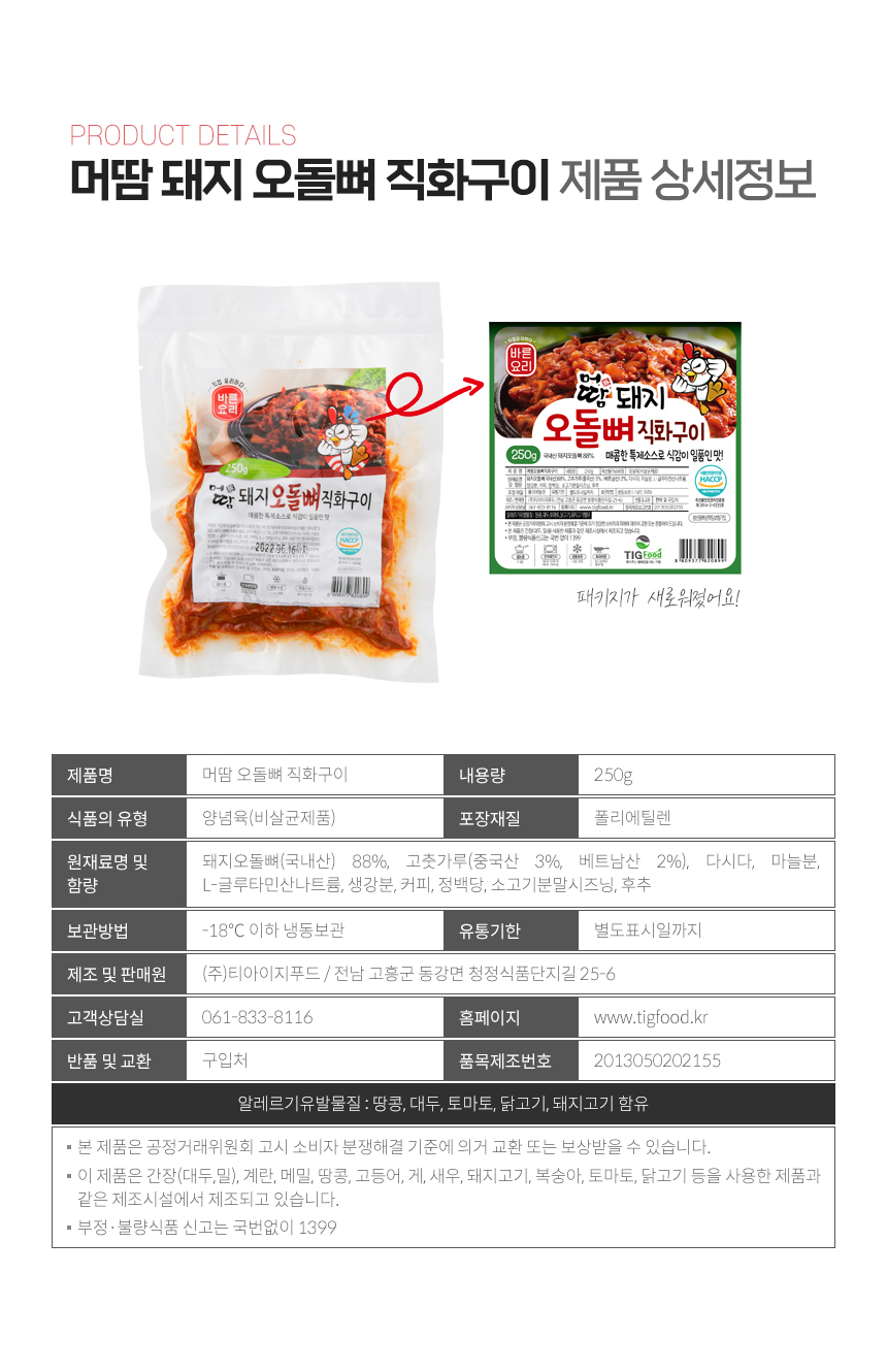 | 원재료명 및 함량 | 돼지오돌뼈(국내산)88%,고춧가루(중국산)3%,고춧가루(베트남산)2%,기타 |