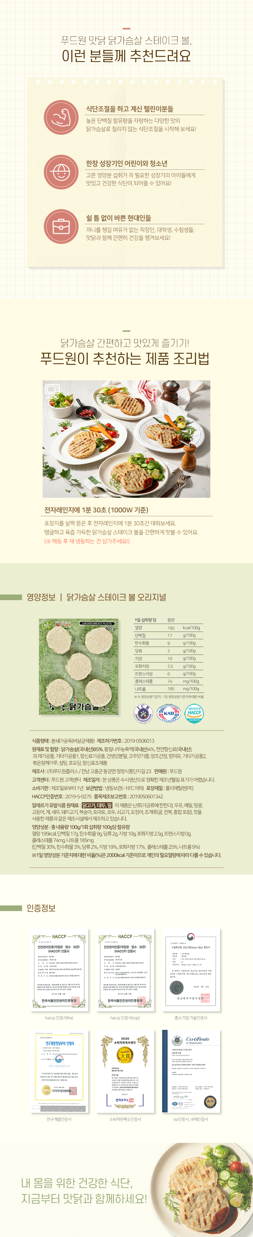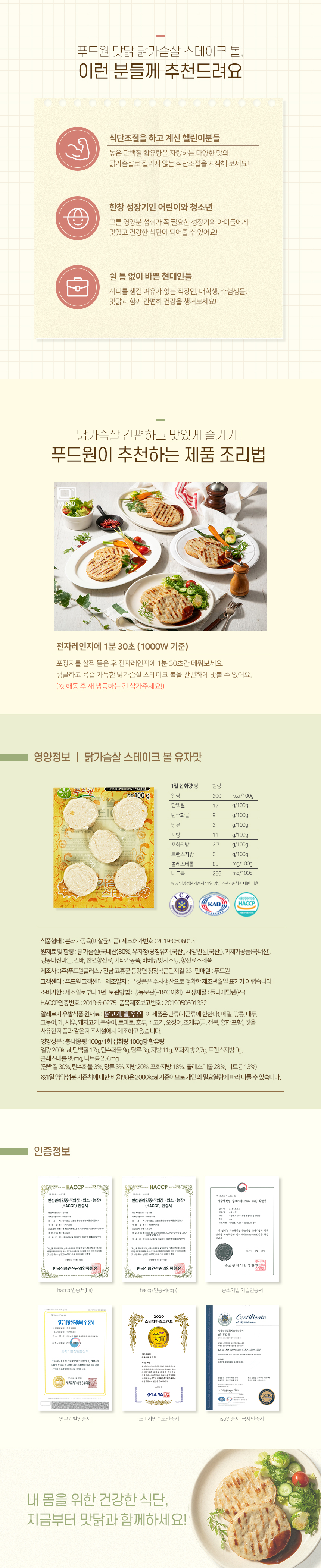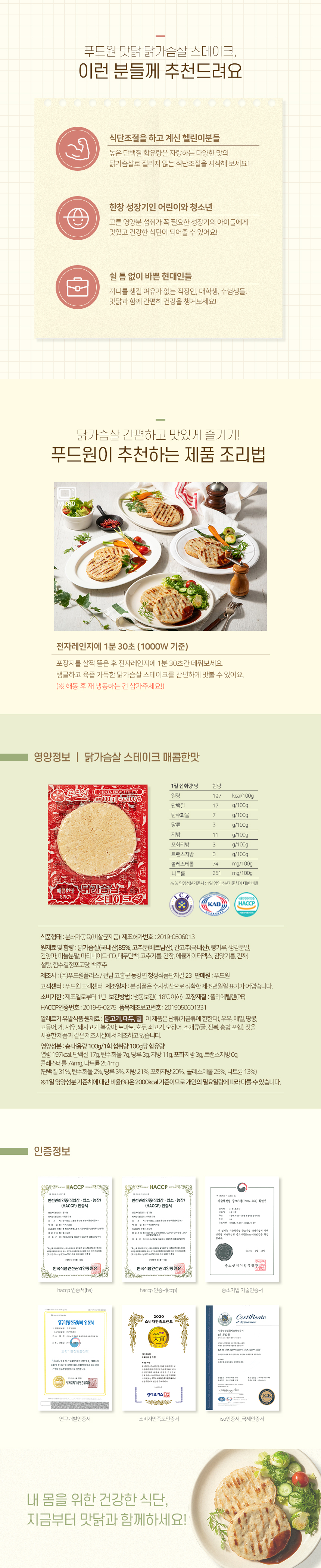 | 원재료명 및 함량 | 닭가슴살 정육(국내산)96-56%,건생강분말1.42%,건양파분말1.42%,치킨시즈닝0.6% |