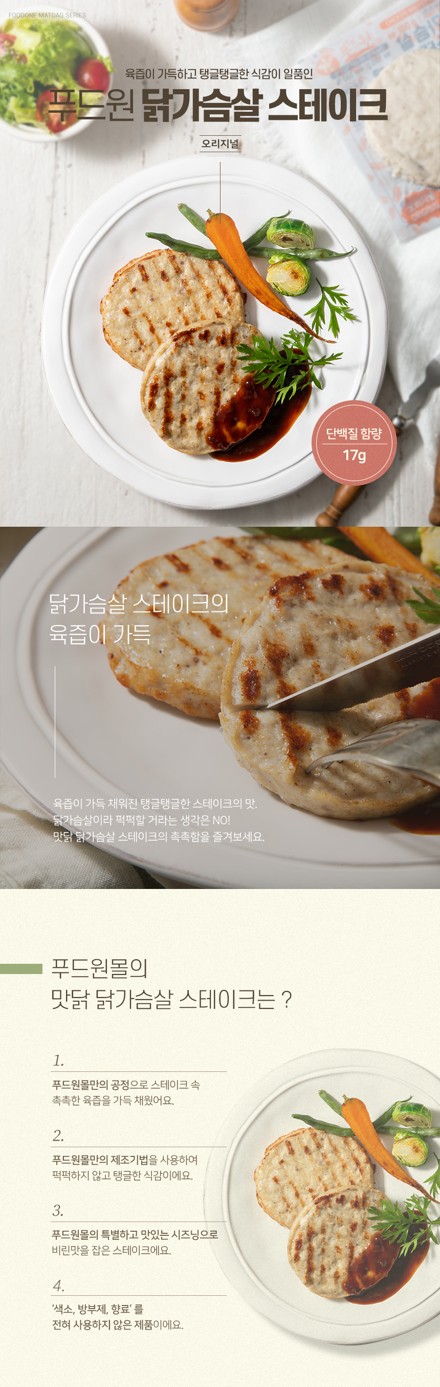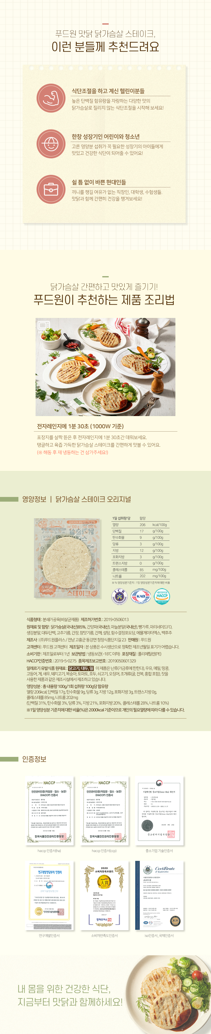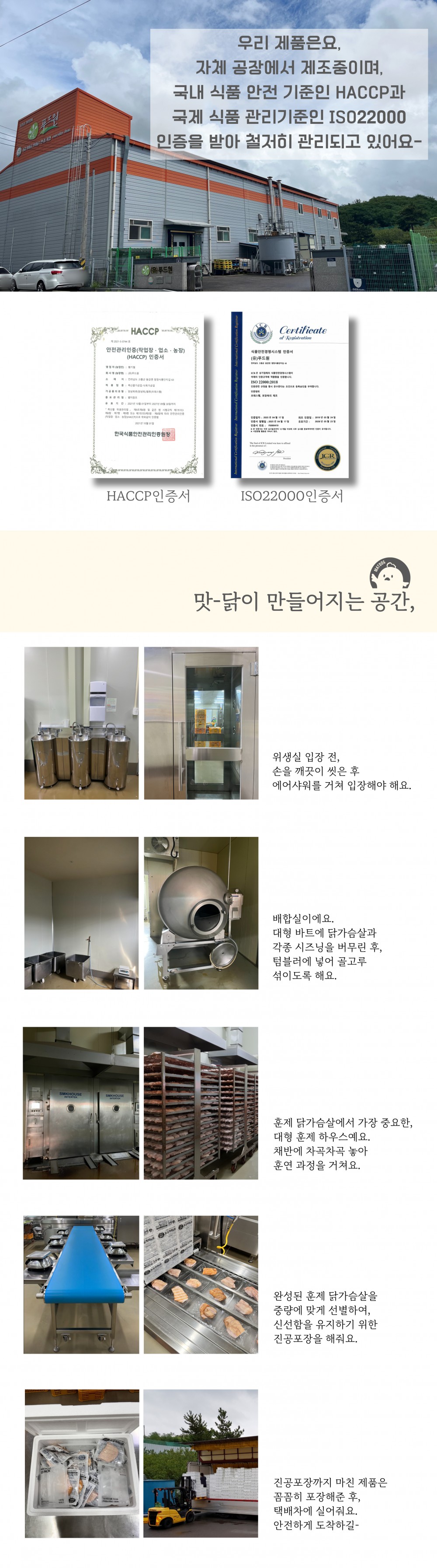 | 원재료명 및 함량 | 닭가슴살 정육(국내산)96-56%,건생강분말1.42%,건양파분말1.42%,치킨시즈닝0.6% |