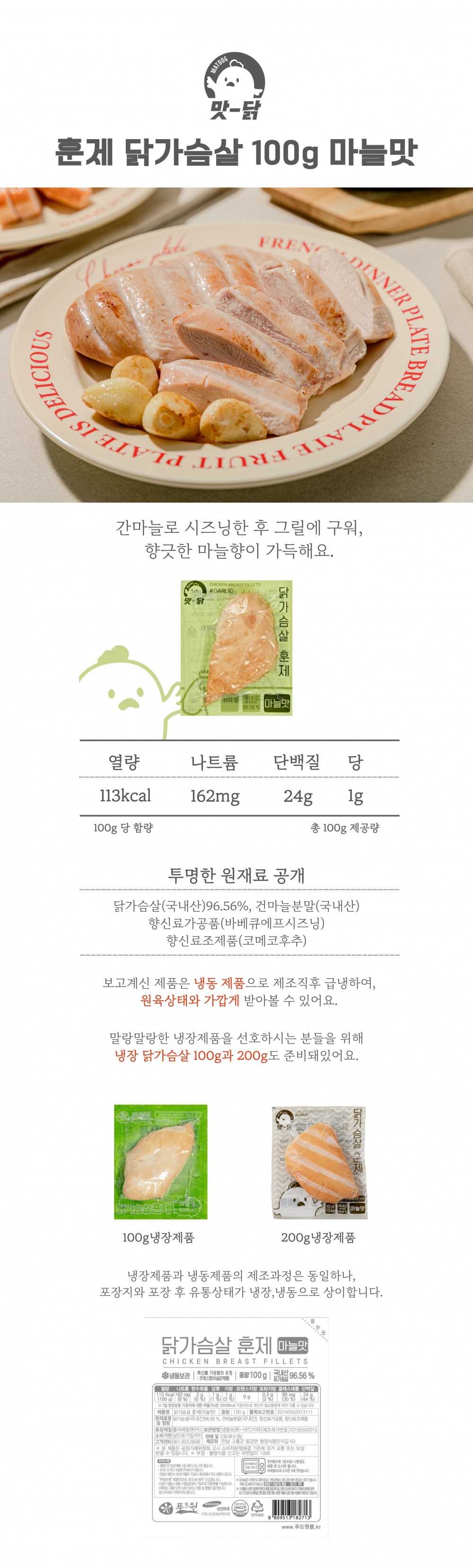 | 원재료명 및 함량 | 닭가슴살 96.56%,마늘2.7%,바비큐시즈닝0.44%,건조백후추0.3% |