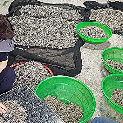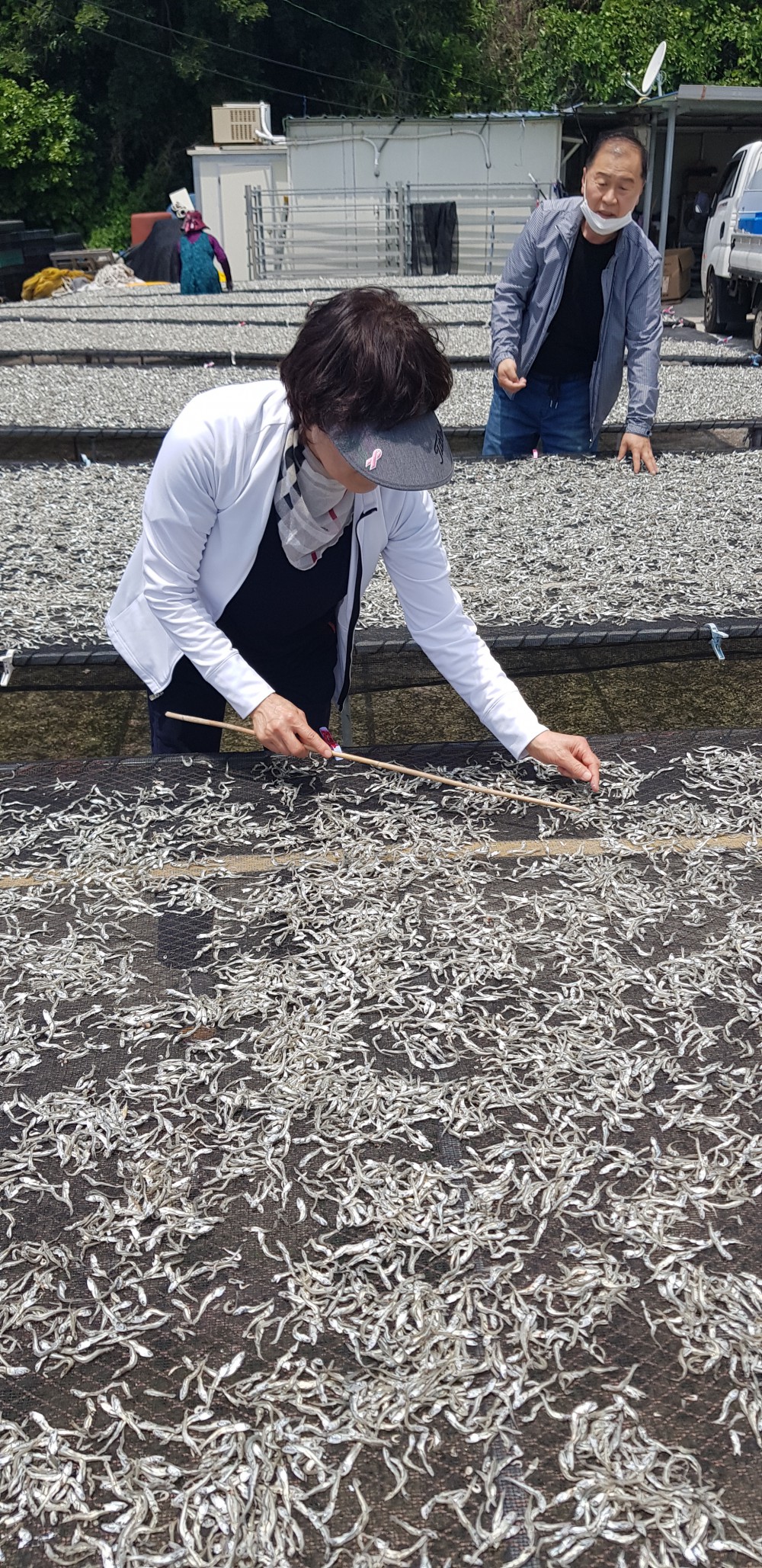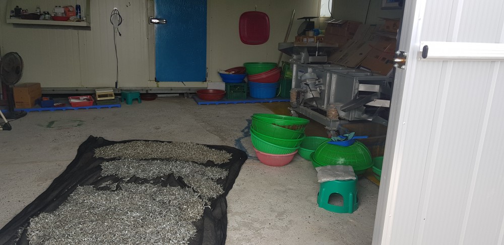 멸치 외 잡어(새끼 아나고, 복어, 새우, 등) 손으로 이렇게 골라 내기도 하고 선별기를 이용하여 선별하기도 합니다.
