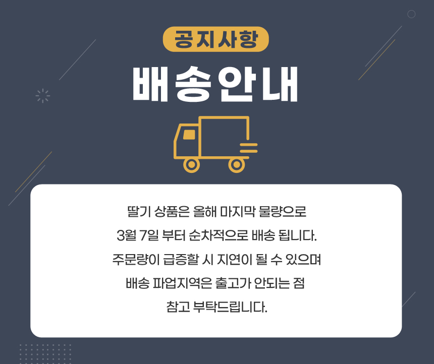 | 지인들에게 선물하기 위해서 구매를 했습니다. 배송도 다음날 바로 출발이 되었고 제가 받았던 딸기는 알도 굉장히 크고 당도도 굉장히 높았습니다. 앞으로도 이런 양질의 상품을 더 소개해주시면 좋을 것 같습니다. 선물받은 지인들도 만족하고 1박스를 먹었던 저도 굉장히 만족합니다. | dnf******* | 2022-03-14 | ![]() ![]() ![]() ![]() ![]() |