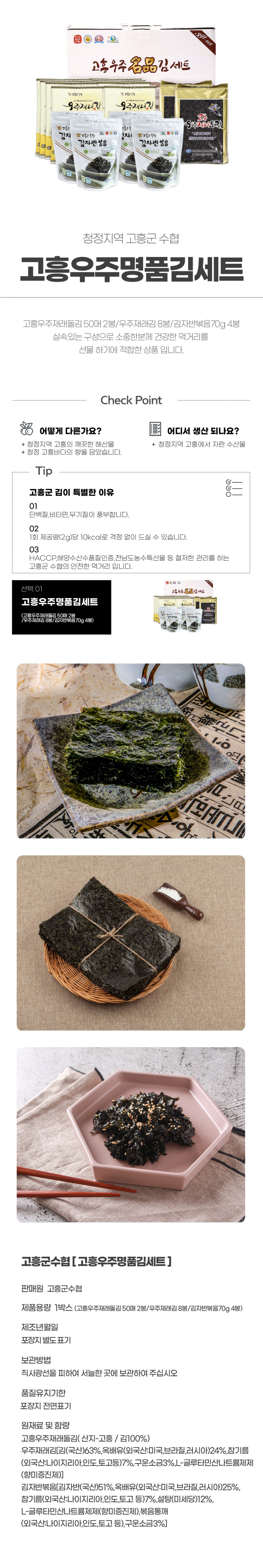 | 포장단위별 수량 | 고흥우주재래돌김 50매 2봉/ 우주재래김 8봉 / 김자반볶음70g 4봉 |