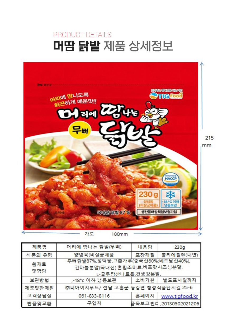 | 원재료명 및 함량 | 닭발(국내산87%,고춧가루3%(중국산),고춧가루3%(베트남산),정백당,건마늘분말,건생강분말,소고기분말향,소고기분말시즈닝 |