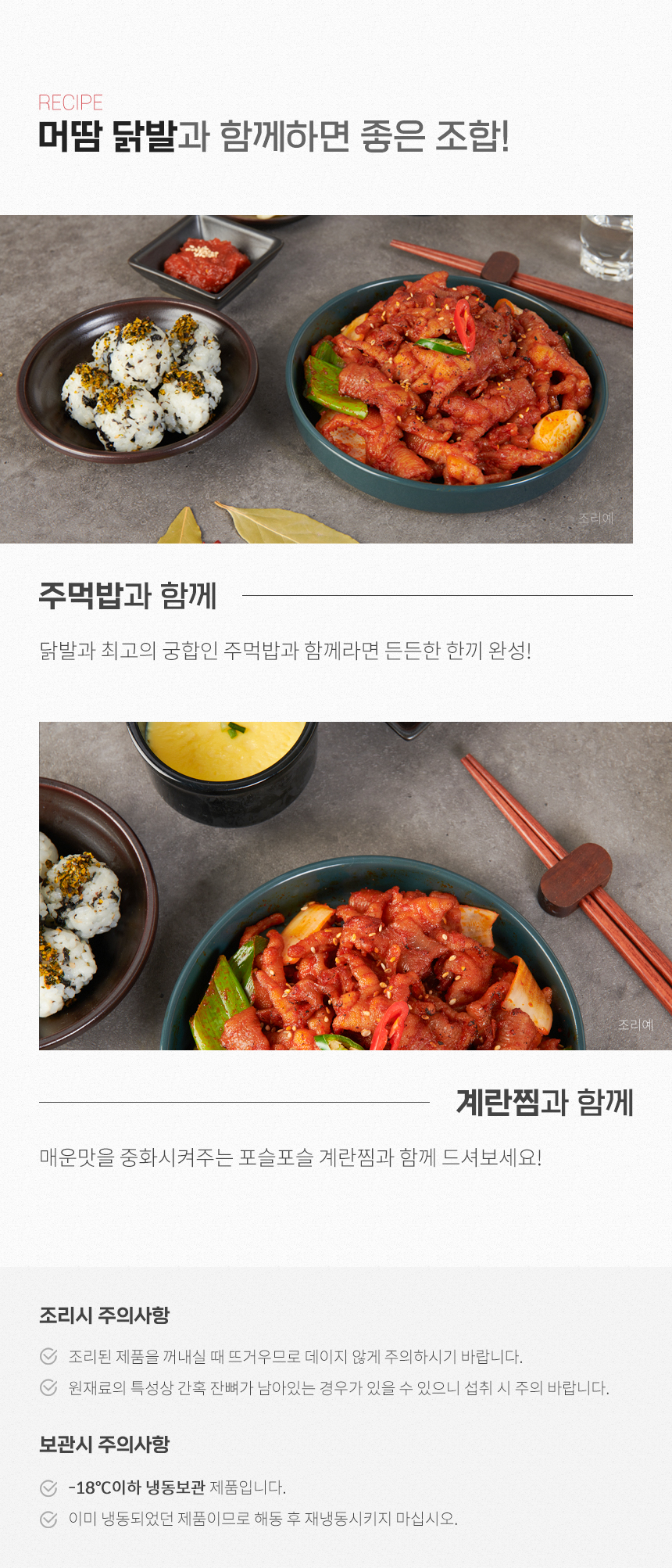 올만에 머리에 땀나는 무뼈닭발, 유뼈닭발, 오돌뼈 등 시켜먹었네요~~ 닭발 먹고 싶을때 양파랑 대파만 넣고 볶다가 무뼈닭발 or 유뼈닭발 넣고 물 100ml 넣고 잘 볶아주면 엄청~ 맛납니다. 그릇에 담고, 참기름과 깨를 듬뿍 넣으면,,,, 정말 배달 닭발 저리가랍니다. 맵지만 아이들도 잘 먹고, 저는 먹을때 마다 계란찜과 주먹밥을 같이 만들어서 먹습니다. 아이들 간식으로도, 술안주로도, 그냥 먹어도 최고입니다... 다 먹으면 또 주문하겠습니당~~~~ 최고최고@!@@ |