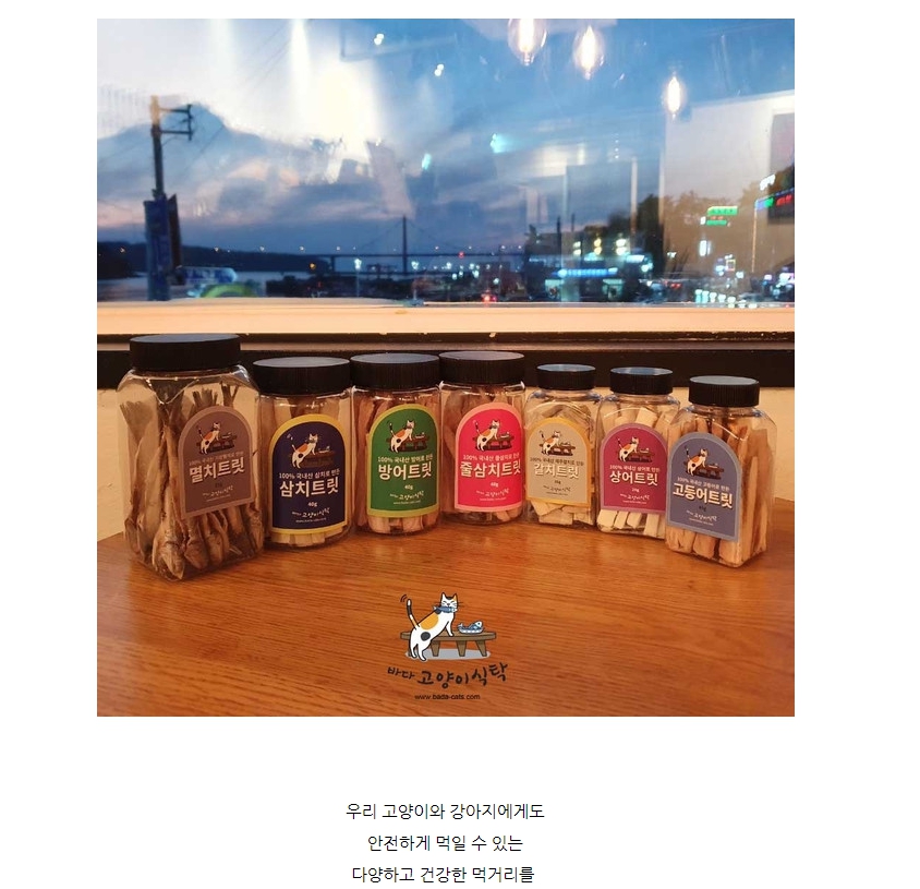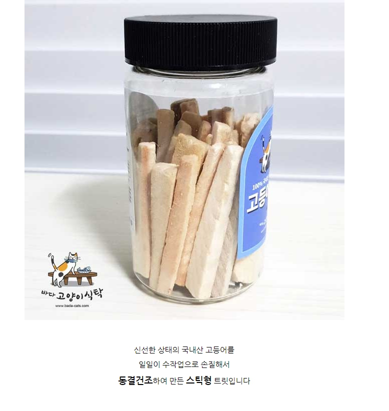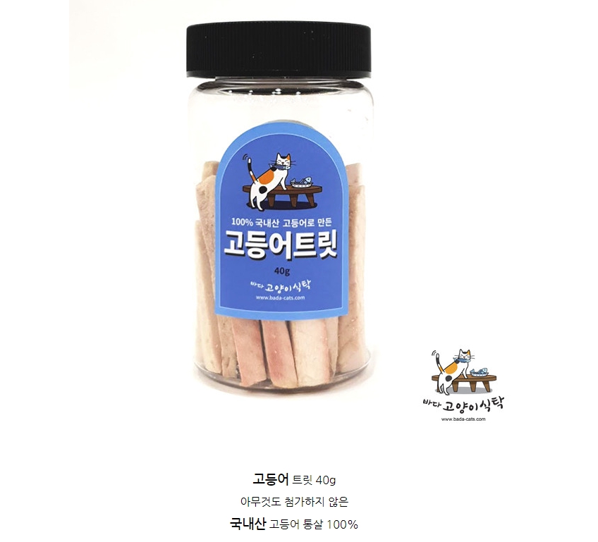 고등어트릿 재구매에요 트릿 종류별로 있지만 바다고양이식탁 브랜드 제품을 제일 좋아해요 통살 그대로 말려서 생선향도 강하고 이 제품 먹을때 제일 행복해하네요 국내산으로 수작업 하니까 저도 믿고 먹일수 있구요 |
