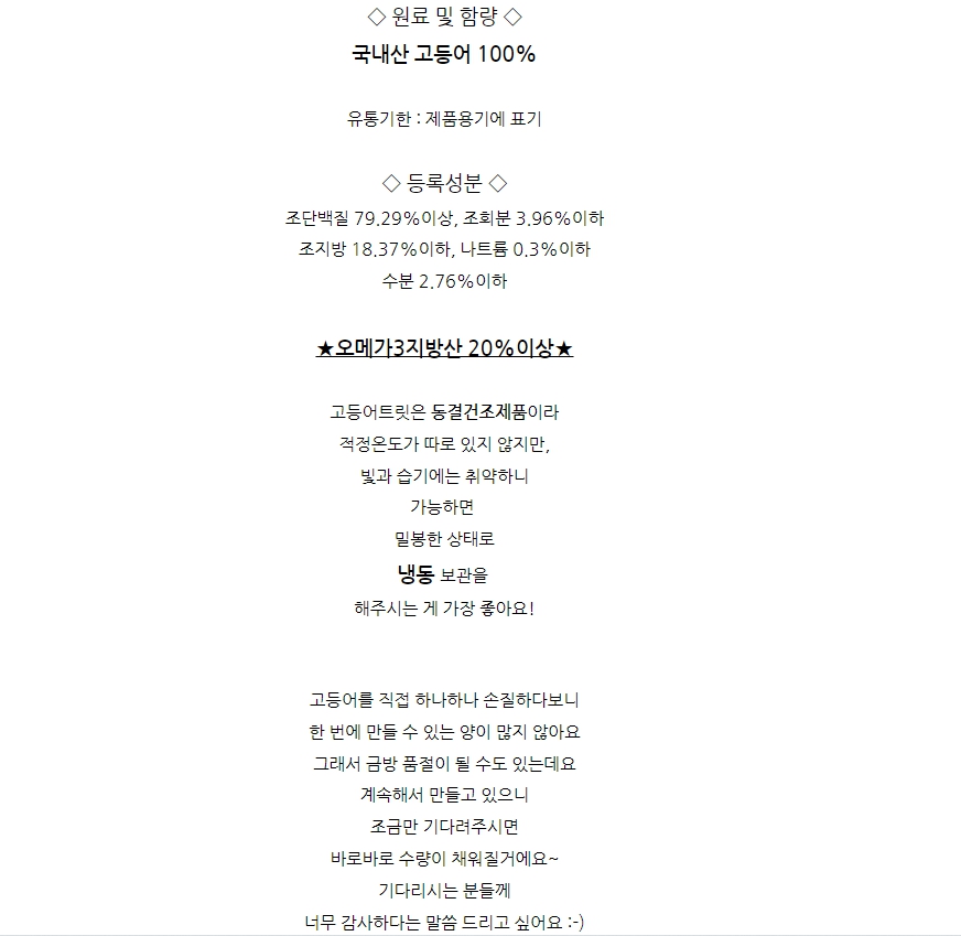 | 원재료명 및 함량 | 국내산 고등어 100% |