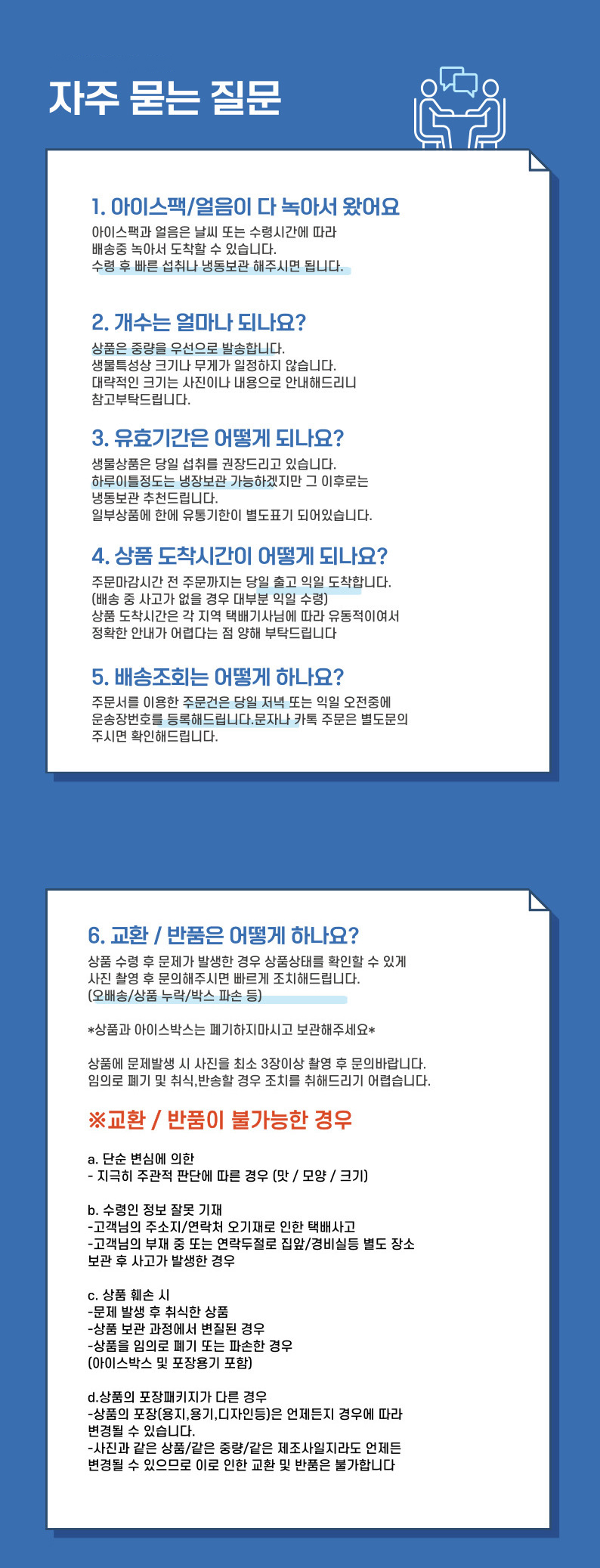 교환 및 반품이 필요하실 경우, 고흥몰 고객센터 Q&A를 확인해 주시면 보다 정확한 절차와 안내를 받으실 수 있습니다.