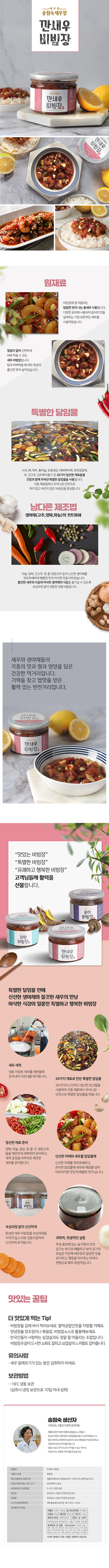 | 원재료명 및 함량 | 새우(수입산)40%,간장10%,정제수,양파,설탕,대파,청양고추,청고추,홍고추,마늘,건고추,물엿,매실,기타주류(맛술 미림),무,배,사과,대추,건새우,가다랑어,정제소금,생강,소주,레몬,월계수잎,감초뿌리줄기,후추열매 |